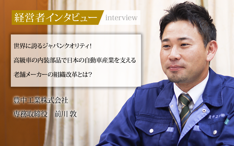 1942年創業の豊中工業株式会社は、内装部品メーカーとして日本の自動車産業を支える老舗企業だ。同社は2001年2月にISO9001認証を取得し、名古屋市の本社工場、豊田工場、富山工場の3工場を展開。開発から生産までワンストップで行う生産体制により顧客の幅広いニーズに対応している。主要製品は自動車やバスの内装部品、鉄道車両用シート、インテリア椅子など。長い年月をかけて培われた生産ノウハウと、日々その技に磨きをかける職人たちの技術力で布・革など多種多様な素材の加工を行う同社の製品は、国内有名メーカーはもちろん、海外向け製品にも採用されている。