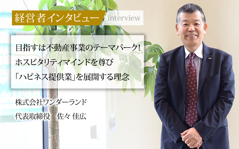 愛知県で不動産事業を展開する、株式会社ワンダーランド。「夢を共有し実現するハピネス提供業」と称して、不動産売買の仲介事業のほか、コンサルティング業務や注文住宅の設計・施工・管理、コインパーキング事業、レンタルスペース事業などを多角的に運営している。「ハピネス提供業」とはどのような事業なのか。代表取締役を務める佐々佳広氏に、経営理念や事業内容を詳しくうかがった。