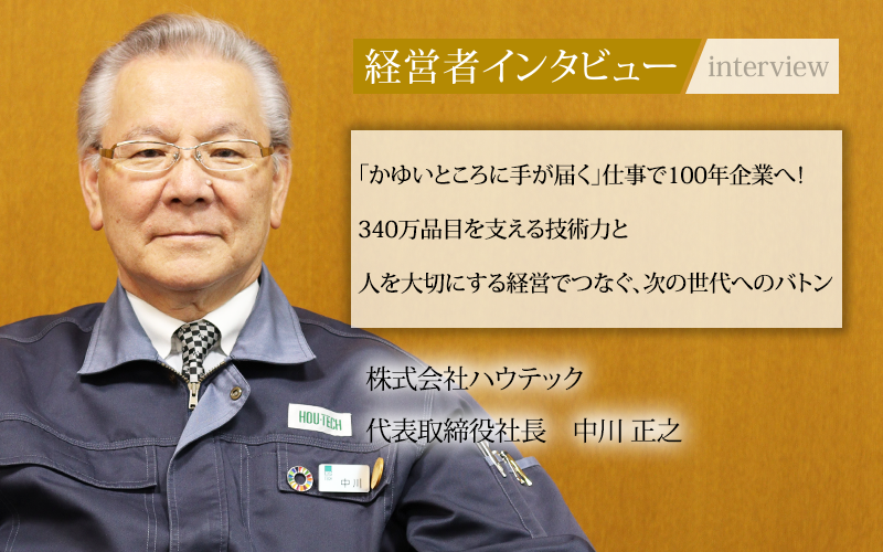 住宅用建材メーカーとして、340万品目という圧倒的な製品群を有する株式会社ハウテック。同社は大手ハウスメーカーとの直接取引を主軸に、年間70万本のドアを供給する一方で、「かゆいところに手が届く」きめ細かな対応でも評価を得ている。創業70周年を目前に控え、社員第一の経営方針と確かな品質で顧客の信頼を築く代表取締役社長の中川正之氏に話をうかがった。