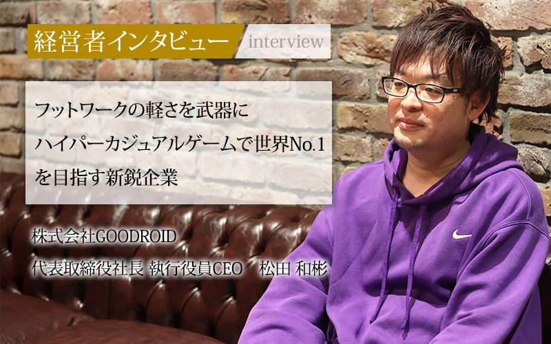 株式会社GOODROIDは、このハイパーカジュアルゲーム市場に注目し、世界トップシェアの獲得を目指している。ゲーム開発のプロ集団を率いる同社の代表取締役社長 執行役員CEO、松田和彬氏に、起業に至るまでの経緯や経営の中で大切にしていることについて話を伺った。