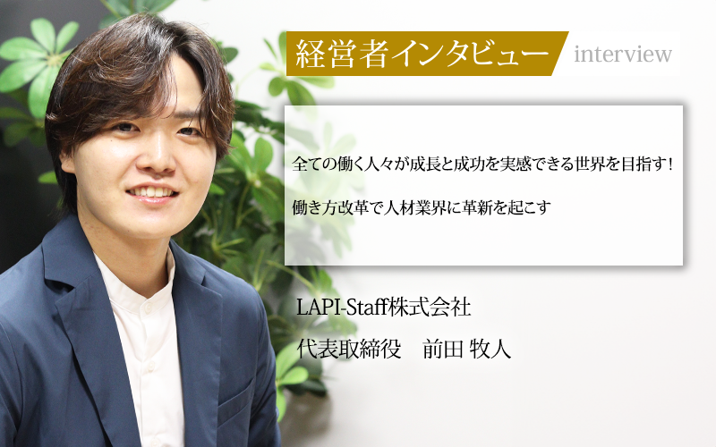 設立からわずか4年で、他社を凌駕する集客力と独自の広告戦略で急成長を遂げ、「ここで働きたい」と思わせる場を提供してきたLAPI-Staff(ラピースタッフ)株式会社だ。代表取締役の前田牧人氏に、設立の背景や推進する戦略、そして描く未来について話を聞いた。