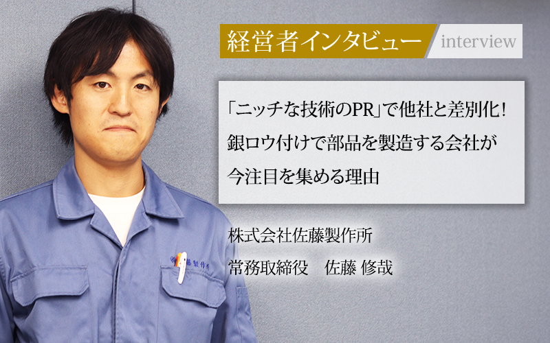 株式会社佐藤製作所は、「銀ロウ付け」という溶接技術をはじめ、金属加工全般を幅広く手がける会社だ。同社の技術力は、さまざまな業界から高い評価を得ている。日本では多くの分野で職人の高齢化が進んでいるが、銀ロウ付けの技術を受け継ぐ同社は、この問題にどのように立ち向かっているのか。常務取締役の佐藤修哉氏に、銀ロウ付けの技術を活かした事業の戦略や強み、さらには今後の展望などの詳しい話を聞いた。