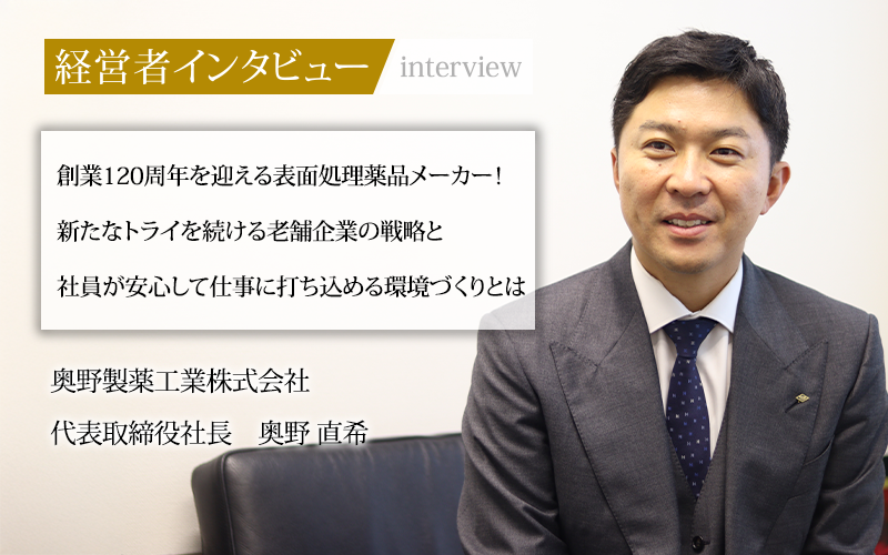 1905年に創業した奥野製薬工業株式会社。めっき薬品やアルミニウム用染料などの表面処理薬剤に加えて、ガラスやコーティング材料などの無機材料や食品向け品質改良剤の研究開発を手掛けてきた。家業を継ぎ、代表取締役社長のバトンを受け取った奥野直希氏に、社長就任の経緯や事業・研究における同社の強み、働く魅力についてうかがった。