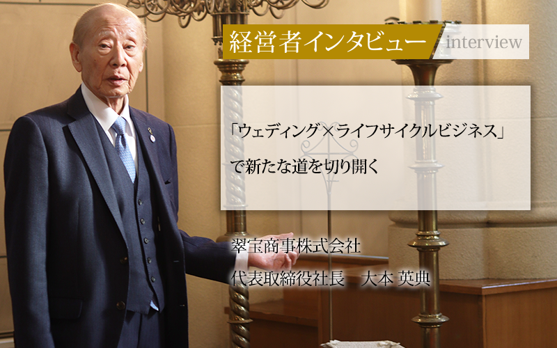 大本英典/1941年、岡山県生まれ。慶應義塾大学卒業後、三井生命保険株式会社(現:大樹生命保険株式会社)に入社。4年後ヘッドハンティングで株式会社いなき屋に入社し、教育・企画などさまざまな事業を手がけ、3年後に独立。1974年に「錦屋貸衣裳店(婚礼衣裳錦屋)」として創業し、1982年に翠宝商事株式会社を設立。ハウスウェディング会場とアイルランドのチャペルを空輸し、岡山県初の独立型大聖堂「セント・パトリック教会」を設立。衣装店の強みを活かした質の高い着物やドレスをはじめ、結婚式、披露宴会場、装花、写真、ケーキ、エステなどを扱う「ワンストップブライダル」を展開している。