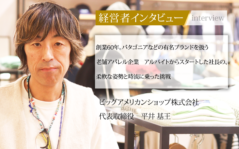 ビッグアメリカンショップ株式会社は、パタゴニア、セントジェームスなど海外有名ブランドのアパレルを扱う企業だ。本社のある岡山県を中心に、実店舗とECサイトを展開している。流行も取り入れながら、スタンダードを大切にする、1964年創業の老舗企業だ。
