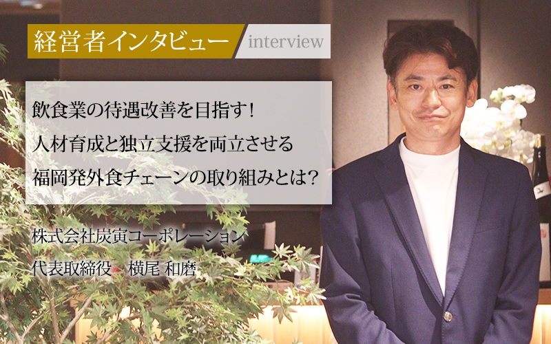 横尾和磨/1972年佐賀県生まれ、九州国際大学卒。1995年、九積セキスイハイム株式会社(現セキスイハイム九州)に入社し、住宅営業を6年間経験。2002年、ヨコオ商事外食事業部(現炭寅コーポレーション)入社。ひなっ子大橋店店長、炭寅天神店店長、営業企画部長、営業部長、常務取締役を経て、2020年に同社代表取締役社長に就任。