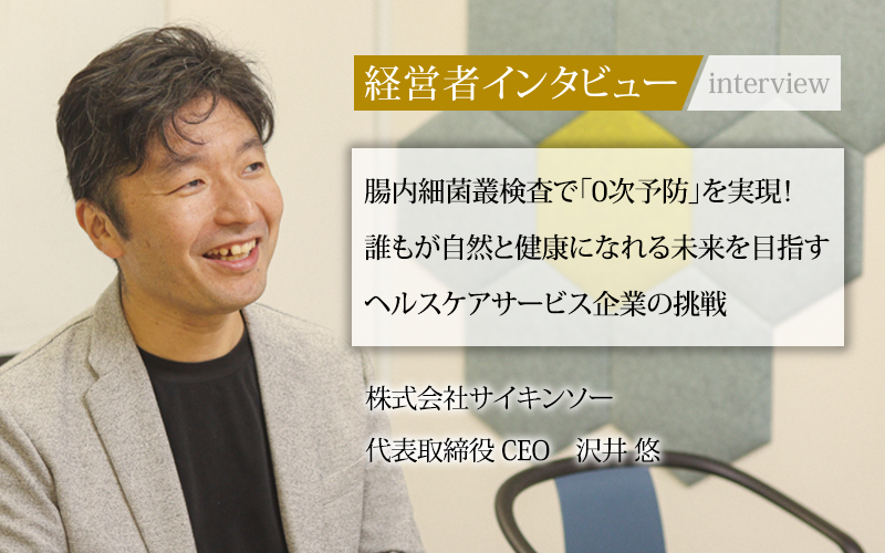 企業の福利厚生として、腸内細菌叢検査を提供することで健康経営の新たな選択肢を提示するなど、BtoB、BtoCの両面でサービスを展開している。病気の予防に留まらず、その前段階で自然と健康になれる状態を目指す「0次予防」という概念を掲げ、腸内環境の改善を通じた健康づくりの普及を目指す、代表取締役 CEOの沢井悠氏に話をうかがった。