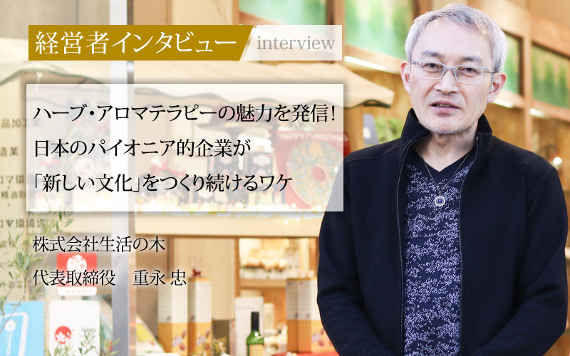 1955年の創業以来、陶器、ポプリ、ハーブティーなど時代に合わせて事業を展開してきた株式会社生活の木。現在は「香り」に関連する製品の開発・販売を軸に、海外でのネイチャーリゾート経営にも注力している。今回は代表取締役の重永忠氏に、事業の変遷や強み、今後の展望についてうかがった。