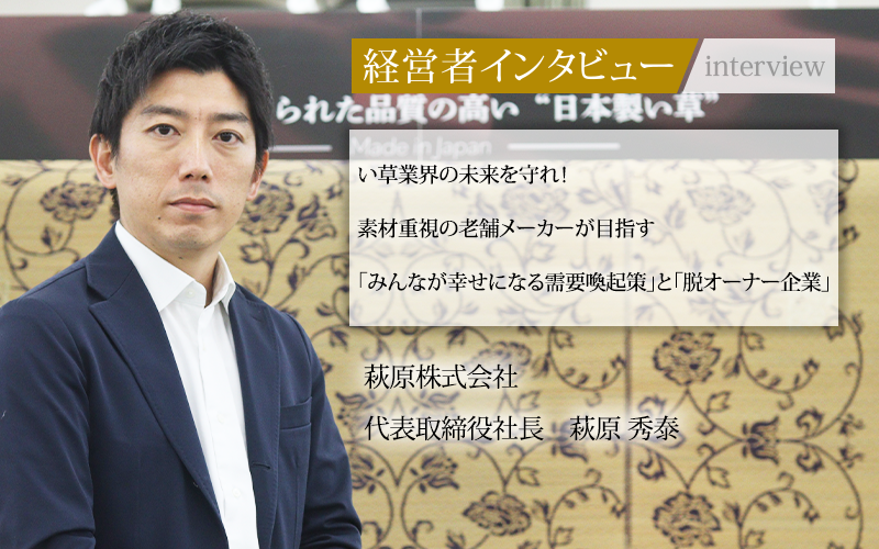 1892年に設立され、「ござ」の輸出事業で創業した萩原株式会社。現在は、家具やい草製品を中心に、素材の特性を生かした家具やカーペットの開発・販売をしている。代表取締役社長の萩原秀泰氏に、就任後の取り組みや事業内容、今後の展望についてうかがった。