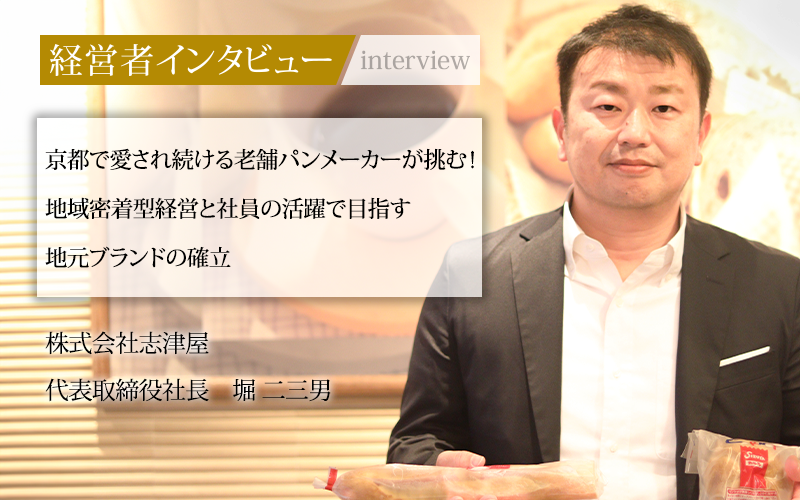 京都の地で昭和23年に創業し、77年にわたり「地元のパン屋さん」として愛されてきた株式会社志津屋。看板商品「カルネ」を筆頭に、安全でおいしいパンをつくり続けてきた老舗企業だ。2024年に代表取締役に就任した堀二三男社長は、地域密着を軸にしつつ、新たな挑戦と改革を進めている。堀社長の目指す志津屋の姿とはどのようなものなのか、自身の経歴や、パンづくりへのこだわり、経営の将来展望などを聞いた。