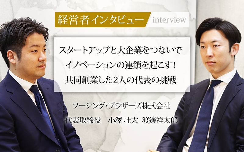 スタートアップ企業の投資への注目が集まっている今、スタートアップと大企業をつなぐ事業でイノベーションを起こしているのが、ソーシング・ブラザーズ株式会社だ。代表取締役の小澤壮太氏と渡邊祥太郎氏に、同社の事業の狙いや今後の構想を聞いた。