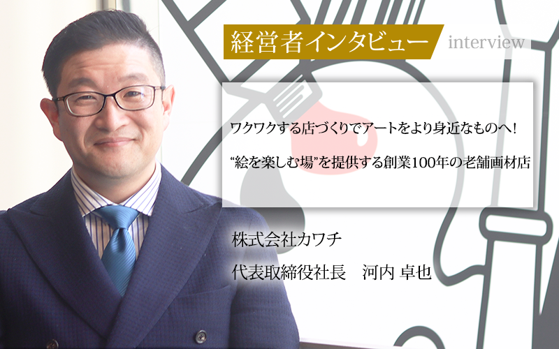 株式会社カワチは、大阪の主要エリアに3店舗ある画材専門店を運営している会社だ。同社は1920年の創業以来、100年以上にわたり、プロのアーティストから初心者の方まで幅広く支持されている。代表取締役社長の河内卓也氏に、距離を置いていたアートに興味を持つようになった経緯や、デジタル時代の画材店経営にかける思いなどについてうかがった。
