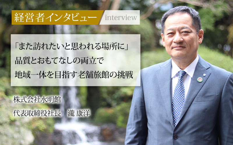 アフターコロナを見据え、多くの観光地や施設が感染対策を強化し、新しい旅の形に対応する努力をしてきた旅行業界。一部の人気観光地では、観光客の過剰な集中が問題となる中、今後は持続可能な観光地管理や分散化が重要になるだろう。ここ数年順調に売り上げを伸ばす株式会社水明館の代表取締役社長である瀧康洋氏から、コロナ禍での取り組みや社員教育、地域連携についてうかがった。