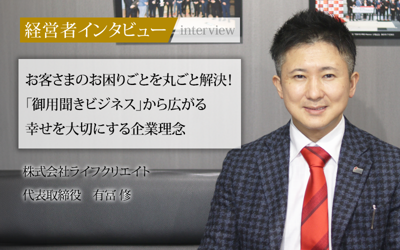有冨修/1979年生まれ。高校卒業後、住宅関連の営業職を経て、25歳で便利屋として独立。2006年、株式会社ライフクリエイト(旧:有限会社ライフクリエイト)を設立。便利屋業とリユース業を融合した「御用聞きビジネス」を展開し、現在は福岡県を中心に15拠点を運営。2024年にはTPM上場を実現した。