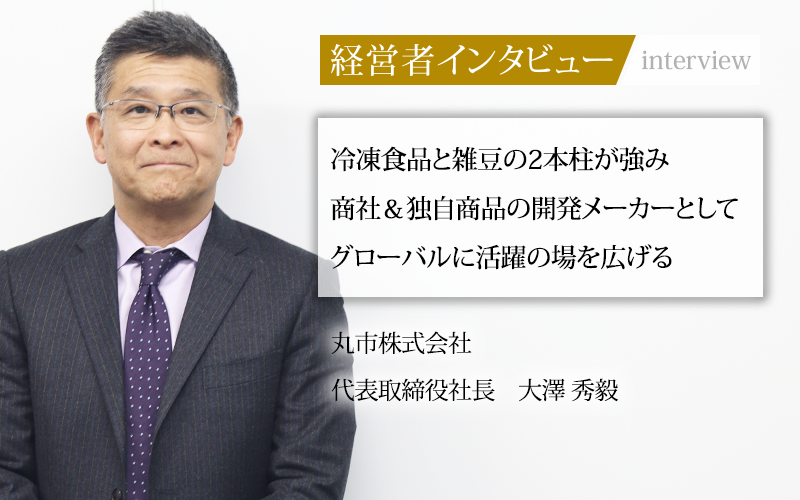 丸市株式会社は冷凍食品と雑豆を取り扱うユニークな食品商社であり、同時に独自の商品開発というメーカー的な機能も合わせ持っている。国内における食材の安定供給の確立に加え、グローバル市場との強固なつながりがさらに新しい市場を切り開こうとしている。同社の代表取締役社長の大澤秀毅氏に、企業の成り立ちや事業の強み、そして未来に向けたビジョンについてお話をうかがった。