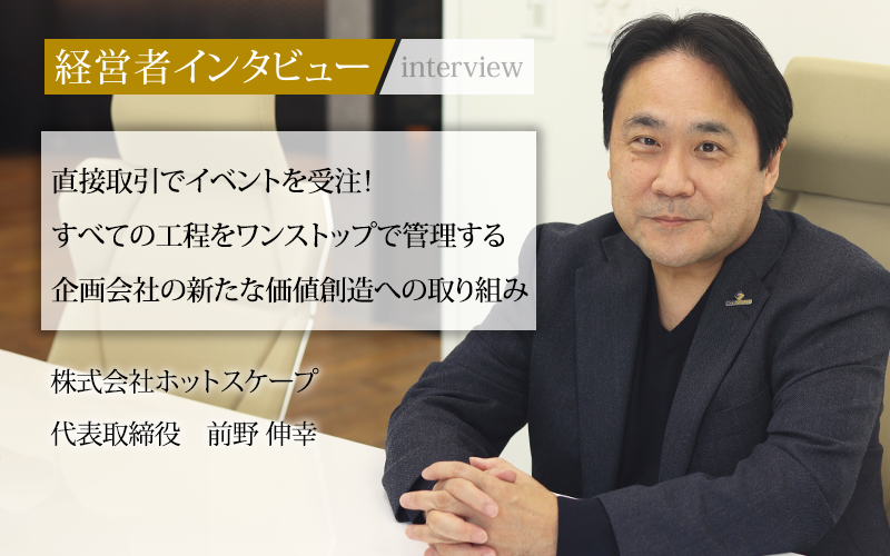 表彰式や社員総会、施設運営など、ビジネスイベントの企画・運営を一手に引き受け、30年以上にわたり業界の第一線で活躍を続けている株式会社ホットスケープ。同社はイベントを通じた社会課題解決や街づくりへの貢献など、事業領域を広げながら着実に成長を遂げてきた。年間120件以上のイベントを手がけ、施設運営のコンサルティングまで行う同社の成長戦略と今後の展望について、代表取締役の前野伸幸氏に話をうかがった。
