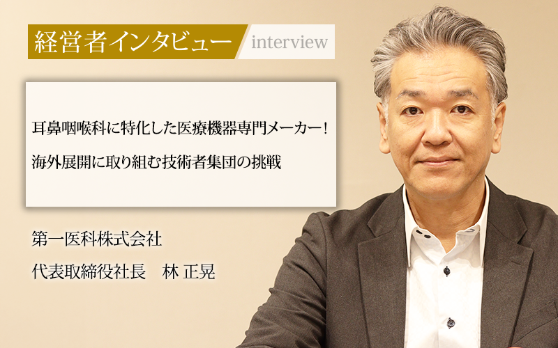 林正晃/1971年、東京都生まれ。慶應義塾大学理工学部卒業。中外製薬株式会社に入社し、大阪でMRとして勤務。父が創業した耳鼻科医療機器に特化したメーカーである第一医科株式会社に入社。2005年、代表取締役社長に就任。