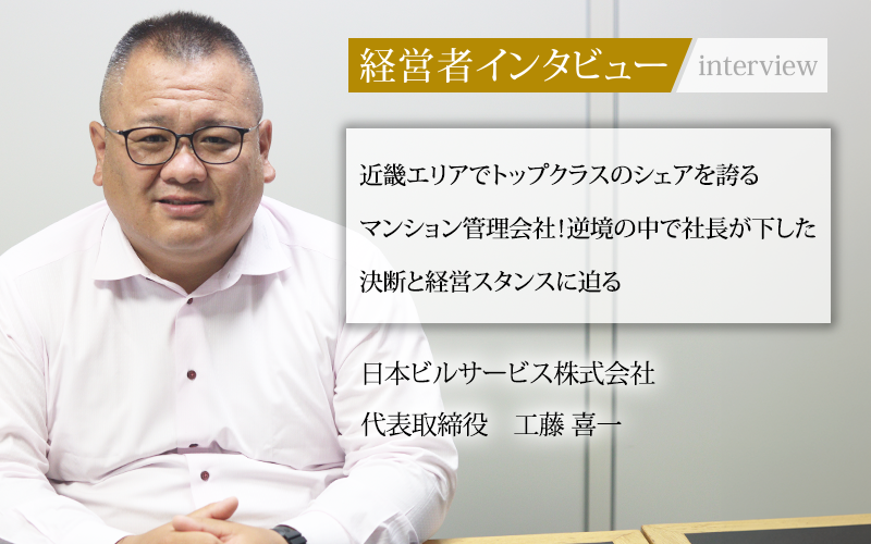 工藤喜一/1982年、北海道生まれ。大阪学院大学卒業。2008年、日本ビルサービス株式会社に入社。理事会運営などのフロント業務を経験後、工事部、管理部などの現場担当を経て、2018年、取締役部長に就任。2019年、代表取締役に就任。