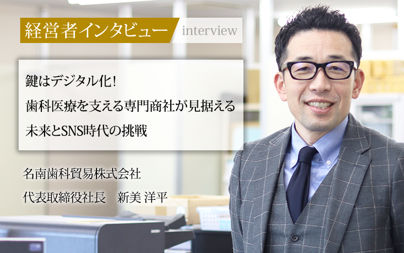 新美洋平/1976年、愛知県生まれ。1998年、名古屋大学法学部卒業。2001年、ニューヨーク州立大学にてMBA取得。2001年、アクセンチュア株式会社に入社し、通信業界を中心に大規模基幹システムのプロジェクトなどに参画。海外勤務も1年間経験。2007年、名南歯科貿易株式会社に入社。2016年、代表取締役社長に就任。歯科製品を紹介する「名南Youtubeチャンネル」の活動にも注力している。