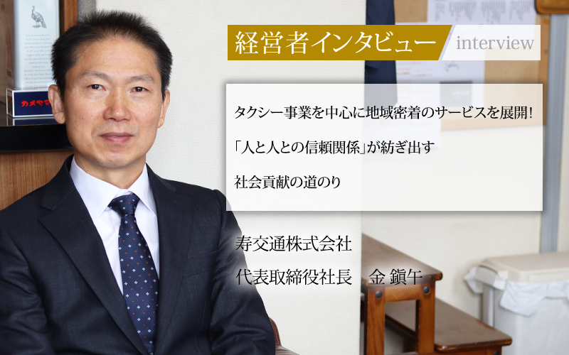 韓国で生まれ、日本で学び、働き、そして家庭を築きながら日本社会への感謝と貢献を胸に、寿交通を率いる金鎭午氏。創業63年を迎えた(2024年時点)同社の社長として、地域密着型のタクシー事業の強みを活かし、新たな挑戦を続ける金社長に、これまでの歩みと未来への展望をうかがった。
