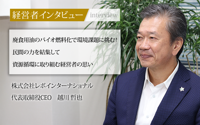 自動車や暖房器具の燃料の元として使われてきた石油。昨今では石油の燃焼時に大量の二酸化炭素が排出されるとして、環境への負荷が問題視されている。そんな中、使用済みの食用油(以下、廃食用油)を活用し、環境への負荷が少ないバイオ燃料事業を行っているのが、株式会社レボインターナショナルだ。廃食用油のバイオディーゼル燃料化に興味を持ったきっかけや、環境保護への思いなどについて、代表取締役CEOの越川哲也氏にうかがった。