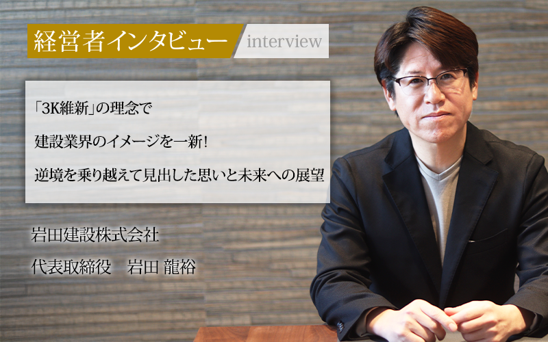 岩田龍裕/1976年、熊本県生まれ。19歳で岩田建設株式会社に入社し、26歳で経営を引き継ぐ。先代からの借金約2億円を7年あまりで完済し、「共生・共栄・共磨」の企業理念を掲げて経営改革を推進。「3K維新(熊本から、建設を、カッコよく)」をキャッチフレーズに、建設業界のイメージを変えるべく、採用育成と事業拡大に注力している。現在は熊本県でトップ25社の一角に入り、さらなる高みを目指している。