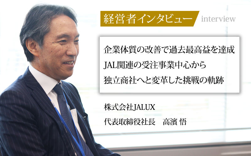 株式会社JALUX(ジャルックス)は、日本航空株式会社(JAL)と双日株式会社のグループ会社であり、航空関連のサービスを中心に多彩な事業を展開している。大企業の傘下で60年を超える安定した社歴をもつ一方、代表取締役社長の高濱悟氏は、大企業に頼りがちな社風を課題と捉えていた。社内改革を積極的に推進した結果、わずか数年で目覚ましい成果が形となって現れた。高濱氏はどのように社風を変革し、今後どのようなビジョンを描いているのか。その取り組みを中心に話をうかがった。