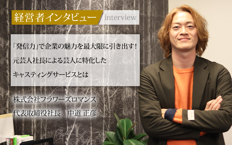 中道正彦/1983年、鹿児島県薩摩川内市生まれ。吉本総合芸能学院(NSC27期)を卒業後、12年間お笑いコンビ「フラワーズオブロマンス」で芸人として活動。芸人を引退後、株式会社フラワーズロマンスを設立。芸人やアーティスト(ミュージシャン、俳優)などの発信スキル、エンタメスキルを活かして企業のSNS運用、映像制作を行う事業を展開。