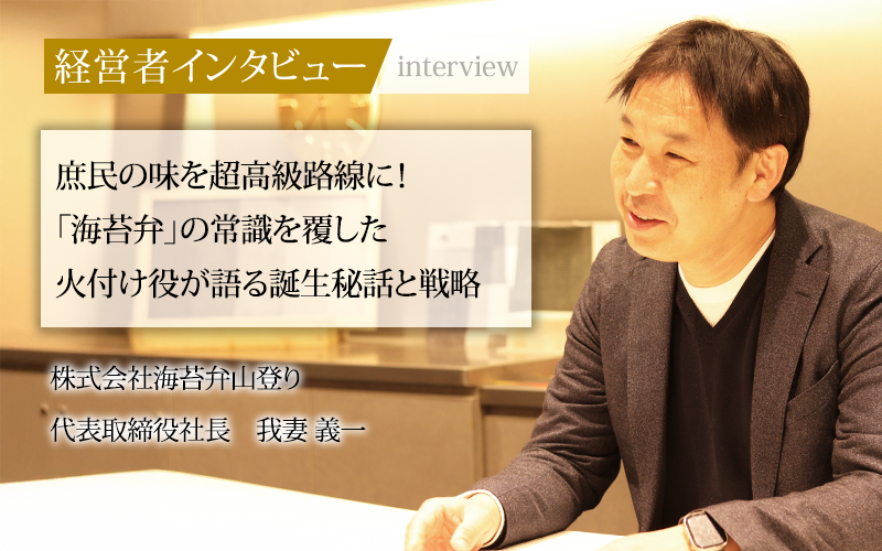 2017年、銀座の一等地への出店を皮切りに、こだわり抜いた素材と意外性が注目を集めて瞬く間に話題となり、東京駅や新橋駅などへと店舗網を広げていった。今回は、この異色の成功を支えた立役者である代表取締役社長の我妻義一氏に、高級海苔弁の発想が生まれた背景や、今後の展望についてお話をうかがった。