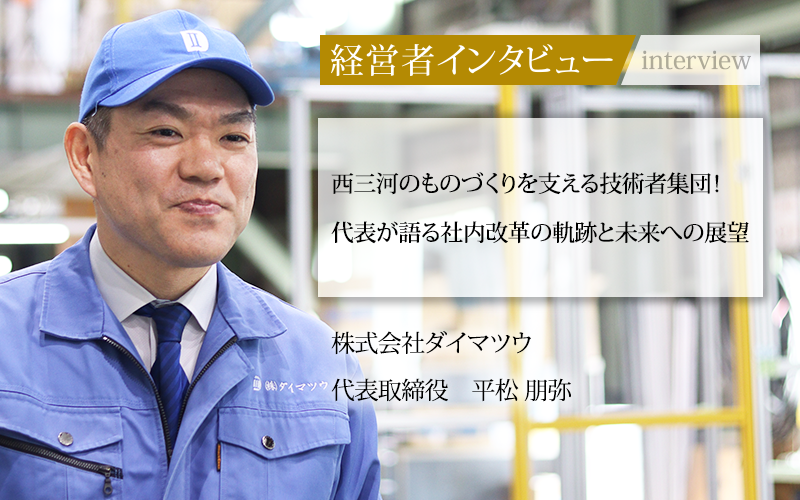 ものづくりが盛んな愛知県三河地方にある株式会社ダイマツウは、製造業の生産設備や機械装置の設計・製造・据付を手がける企業だ。父親から事業を引き継いだ代表取締役の平松朋弥氏は、人事評価の見直しや生産管理の自動化など、社内改革を進めている。