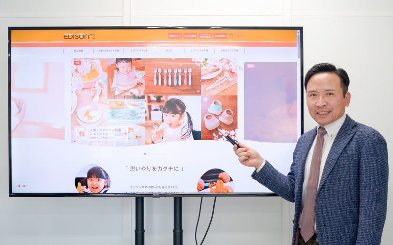 弊社は「EDISONmama(エジソンママ)」ブランドを主力として、ベビー用品の企画開発、製造、輸出入を手がけています。創業当初から価格勝負ではなく、品質とオリジナリティにこだわってきました。また、最近では子育て記録ができるLINEを活用したアプリをリリースするなど、商品だけでなく情報コンテンツの提供も行っています。