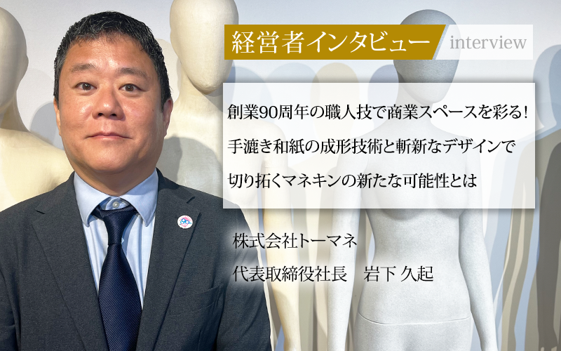 マネキン制作から商業スペースの内装施工まで、幅広いディスプレイソリューションを手がける株式会社トーマネ。2年の開発期間を経て完成させた手漉き和紙造形「WALTZ(ワルツ)」でグッドデザイン賞を受賞し、特許も取得。さらに、従来のマネキンの常識にとらわれない斬新な造形の「Parkour-series(パルクールシリーズ)」を開発するなど、独自の技術と創造性で商業スペースに新たな価値を提供している。1934年創業の老舗企業で、現在は三代目となる代表取締役社長の岩下久起氏に話をうかがった。