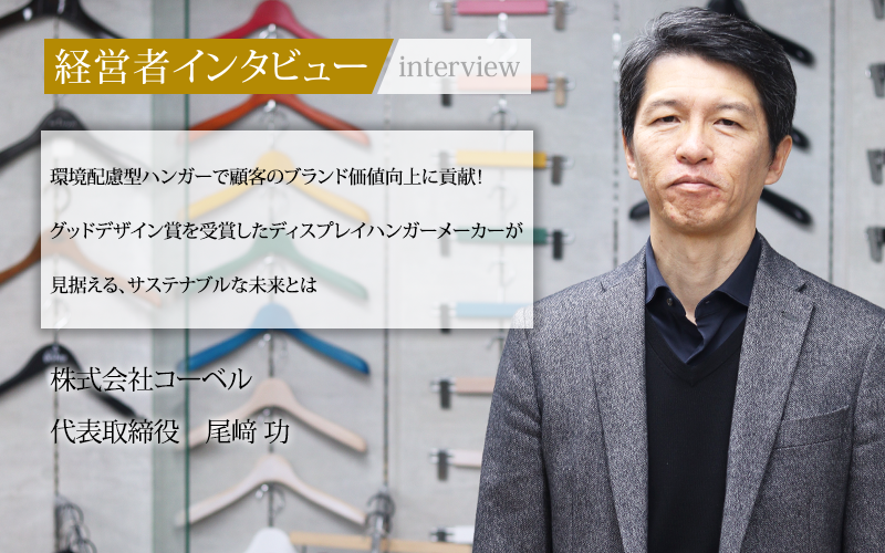 業務用ハンガーに新たな価値を見出す株式会社コーベル。アパレル企業やホテル、フィットネスクラブ、温浴施設など、幅広い業態で採用される同社のハンガーは「掛けるための道具」を超えて、ブランドの価値を高める存在となっている。2021年にはバイオマス素材を活用したハンガーシリーズがグッドデザイン賞を受賞するなど、環境配慮とデザイン性の両立でも高い評価を得ている。2代目として事業を引き継ぎ、新たな挑戦を続ける同社代表取締役の尾﨑功氏にお話をうかがった。