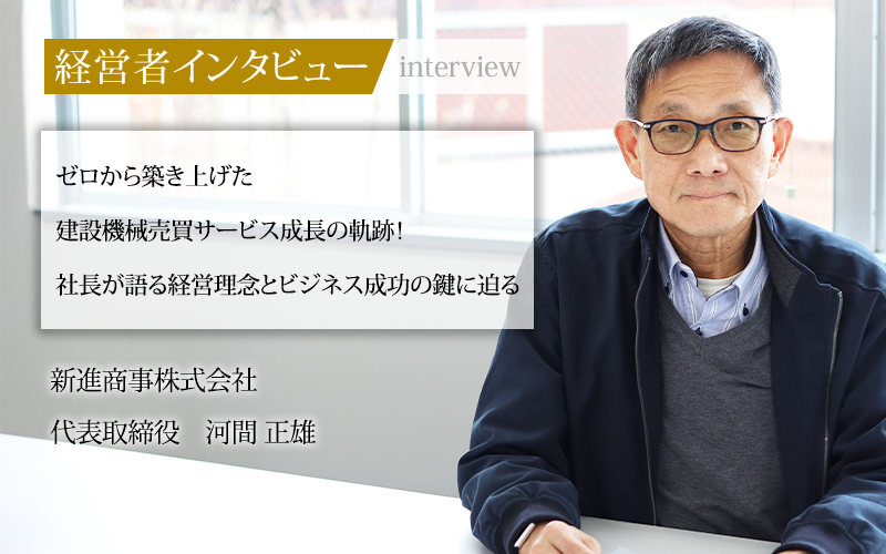 新進商事株式会社は、2003年に設立された建設機械の買取販売・販売サイト運営を行う会社だ。中古建設機械市場に着目し、インターネットオークションを運営し、ヤフーオークションとも連携している。近年ではAIも活用し、事業を拡大している注目企業だ。同社を設立した代表取締役の河間正雄氏に、これまでの経緯や今後の展望などについて話をうかがった。