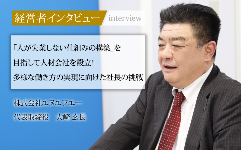 大崎玄長/1973年大阪府生まれ、中央大学卒業。株式会社日本エル・シー・エーに入社し、経営開発部所属経営コンサルタントとして社会人生活をスタート。2000年中小企業診断士登録。2006年株式会社エヌエフエー設立、代表取締役に就任。派遣事業を主軸に、自社研修センターの運営や派遣先の労務経営相談も手がける。社会保険労務士有資格者でもある。
