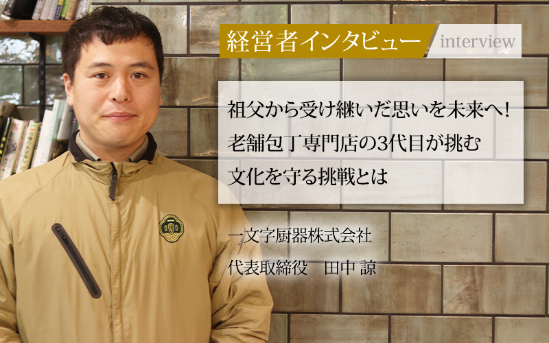大阪・千日前道具屋筋商店街で70年以上にわたり、包丁専門店「堺一文字光秀」を営む一文字厨器株式会社。プロの料理人からも厚い信頼を得る同社は、包丁の販売だけでなく、研ぎ直しや使い方のサポートまでを一貫して手がけている。2024年には、店舗2階に日本の食文化と道具文化を興すためのイベントスペース「一十一(いちとい)」をオープンした。伝統を守りながら革新に挑む、3代目社長の田中諒氏に話をうかがった。