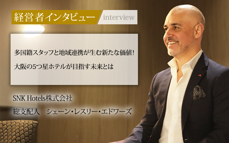 南海電鉄のなんば駅に直結、大阪の中心地で堂々の5つ星を誇るスイスホテル南海大阪。世界的に展開するホテルグループの一翼を担い、日本における同ホテルの運営を指揮するのは、SNK Hotels株式会社総支配人のシェーン・レスリー・エドワーズ氏だ。日本での新たな挑戦への思いや同ホテルの今後の展開について、同氏にお話をうかがった。
