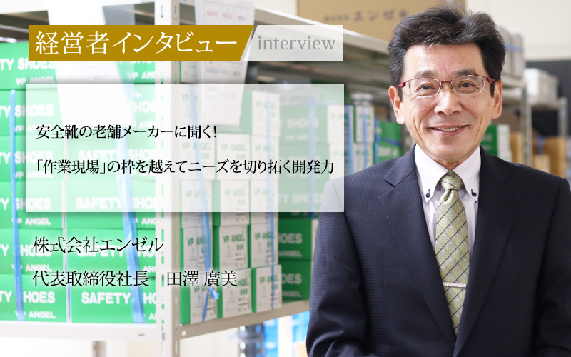 1954年の創業以来、革製の安全靴・作業靴を製造・販売してきた株式会社エンゼル。長年のノウハウから生まれる高品質な製品と、取引先・仕入先のネットワークで大手と差別化してきたメーカーだ。また、近年はデザイン性のある安全靴でも注目を集めている。代表取締役社長の田澤廣美氏に、メーカーとしての強みや社内の開発体制、今後の展望についてうかがった。