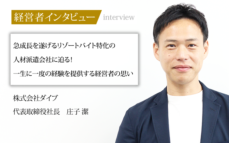 庄子潔/1997年仙台市立仙台高等学校卒業。高校卒業後、2年間米国に留学。帰国後、人材ビジネスに興味を持ち、人材会社へ就職。そこでの出会いをきっかけに、2002年に観光地に特化した人材会社、株式会社ダイブの設立に参画。創業初期より第一線で事業拡大に貢献。2012年代表取締役に就任。2024年東京証券取引所グロース市場へ新規上場。