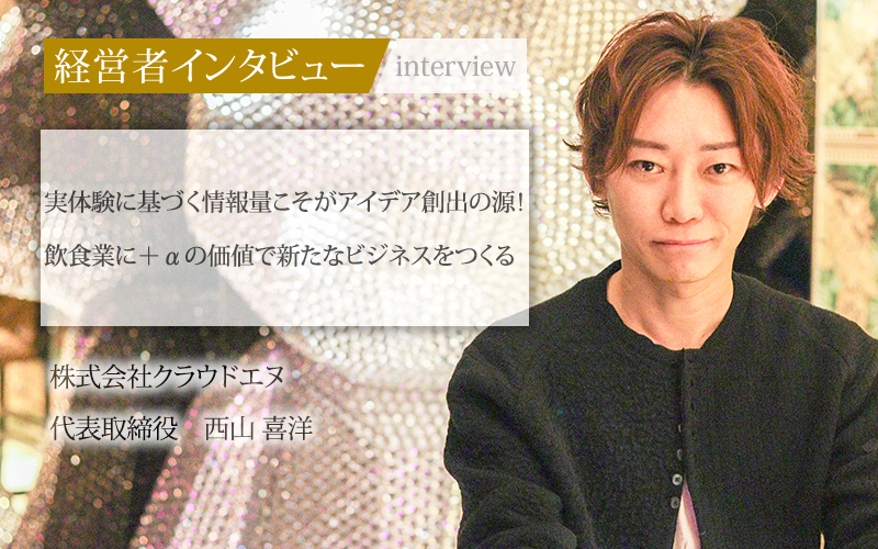日本にまだなかった相席文化をつくり、国内に32店舗、海外に1店舗を展開する株式会社クラウドエヌ。まだ見ぬものを生み出すアイデアはどこから湧き出るのだろうか。事業内容とともに、インスピレーションを得る方法について、代表取締役の西山喜洋氏に話をうかがった。