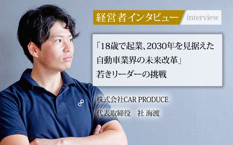 社海渡/1994年岡山県生まれ、2017年岡山商科大学卒。2012年に現CAR PRODUCE創業、2017年株式会社CAR PRODUCE設立。現在は2030年の上場を見据え邁進中。