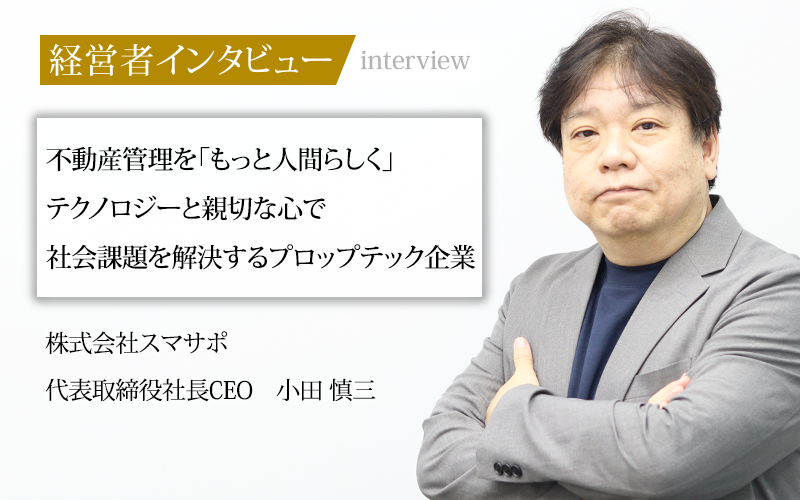 小田慎三/1969年大阪市生まれ。2003年、総合不動産会社である株式会社宅都に入社。経営企画社長室(室長)、常務取締役(TAKUTOグループ)を歴任。2015年、賃貸管理業界における入居者と管理会社とのコミュニケーションを円滑にするため、社内ベンチャーとして株式会社スマサポを設立、代表取締役社長CEOに就任。2019年にTAKUTOグループから独立。2022年、東証グロース市場に上場。