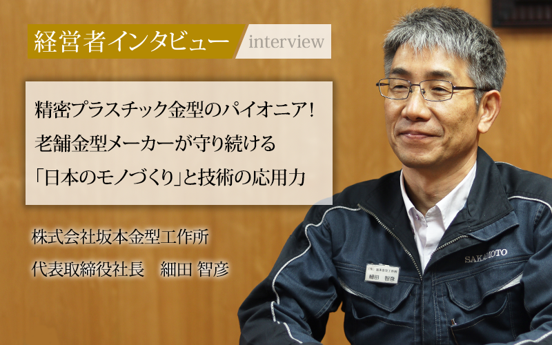 1964年に設立された株式会社坂本金型工作所は、金型づくりにおいて70年以上の歴史を持つ会社だ。設計から製造までをワンストップで手がける生産体制と、DSI金型(組立成形)をはじめ、高難度・高品質なモノづくりを可能とする技術力を武器に、幅広い業界に向けて精密プラスチック金型を供給している。代表取締役社長の細田智彦氏に、入社の経緯やモノづくりへの思い、今後の展望をうかがった。