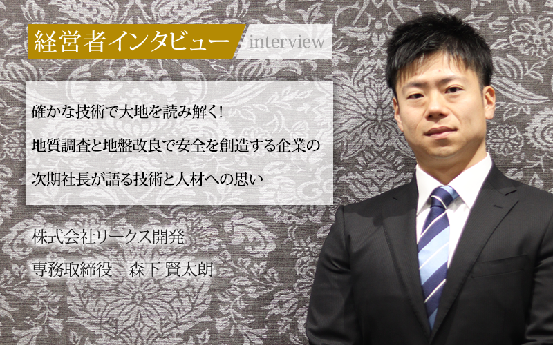 地面に穴を掘り、その土地が何でできているかを調査する「地質調査」と建物の基礎を固める「地盤改良工事」をメインに手がける株式会社リークス開発。近年では防火水槽の設置工事や産業廃水処理施設の建設まで事業領域を広げている。20代で専務取締役に就任し、2025年9月に代表取締役へ就任予定の森下賢太朗氏に話を聞いた。
