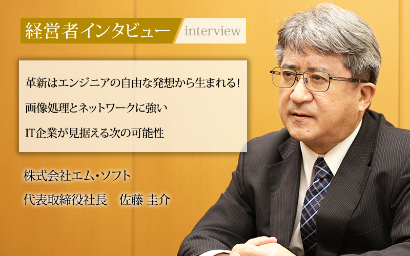 画像技術とネットワーク技術を強みとする、株式会社エム・ソフト。AR(拡張現実)技術と3D画像技術を組み合わせた設備点検ソリューションなど、革新的なサービスを生み出している。そんな同社を今日まで支えてきたのが、1987年の創業当時にエンジニアとして入社し、2022年に代表取締役社長に就任した佐藤圭介氏だ。