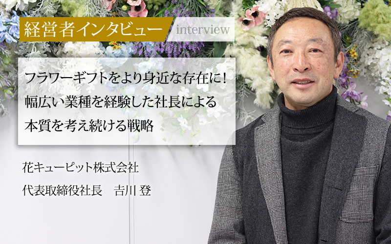 フラワーギフトを通じて、一人でも多くの笑顔が生まれることを願い、全国の生花店とともに事業を推進する企業、花キューピット株式会社。新鮮な花を配送する独自のサービスで、他社との差別化を実現している。さらに、約4000店の生花店ネットワークを活かした新たな価値創造にも積極的だ。代表取締役社長の吉川氏に、同社の強みや今後の展望について詳しく話をうかがった。