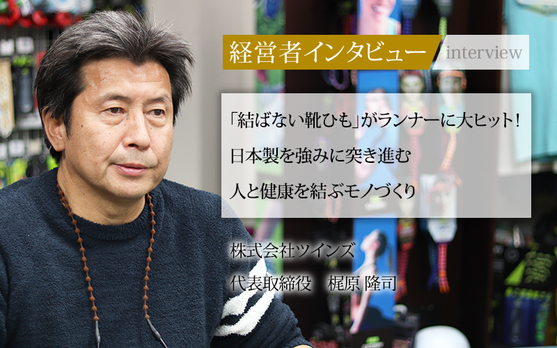 1999年に設立された株式会社ツインズ。生活者の「元気」と「健康」を追求する企業として、スポーツ・健康・ケアに関わる商品を開発してきた。一番の売れ筋商品は、結ぶ必要がない伸縮性のある「靴ひも」である。代表取締役の梶原隆司氏に、看板商品が生まれた背景や独自のブランディング、今後の展望についてうかがった。