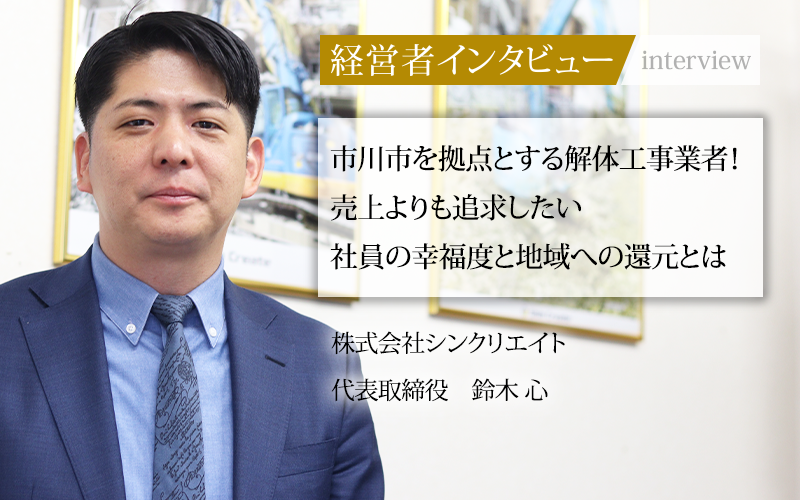2014年に設立された株式会社シンクリエイト。千葉県市川市に本社を置く建設業者として、解体・仮設工事、修繕工事・内装工事、産業廃棄物の収集運搬業、土木工事など幅広い事業を手がけている。さらに2022年には新規事業として、子ども食堂を併設した飲食店をオープンした。代表取締役の鈴木心氏に、創業の経緯や地域貢献への思い、今後の展望をうかがった。