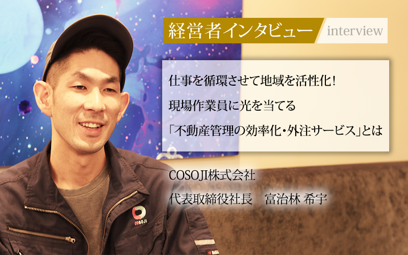 不動産の管理業務を効率化するDXサービスや、物件の清掃や草むしりを地域住民に委託するアウトソーシングサービスなどの事業を手がけるCOSOJI株式会社。同社は、不動産業界でキャリアを積んだ富治林希宇氏が、業界での自身の経験をもとに共同創業した会社だ。全国多くの投資会社、不動産会社、管理会社、大家、清掃貸家などで利用されるなど、今注目を集めている同社のサービスとは一体どのようなものなのか。富治林氏に詳しい話を聞いた。