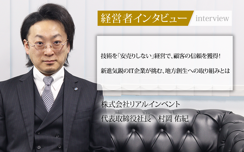 インフラ構築からウェブ制作、動画コンテンツまで、ITに関するさまざまなソリューションを提供する株式会社リアルインベント。同社は創業以来、エンジニアの価値を守り抜く姿勢を貫き、高い技術力と一つひとつの案件に誠実に取り組む姿勢で、顧客からの信頼を獲得してきた。近年では地方のDX推進を通じて、地方と都市をテクノロジーでつなぐ取り組みに注力している。そんな同社の事業展開の軌跡と今後のビジョンについて、代表取締役社長の村岡佑紀氏に話をうかがった。